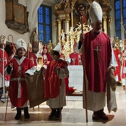 Mit einem königlichen Einzug begann der Sternsingergottesdienst am Dreikönigstag. Diakon Michi Zepf zelebrierte die Wort-Gottes-Feier mit Kommunionspendung zum „Hochfest der Erscheinung des Herrn“. In vielen Texten und Liedern kam das Anliegen der Dreikönigsaktion zum Ausdruck. Noch einmal trat eine Sternsingergruppe auf und präsentierte ihre Botschaft. Die Segnung des Dreikönigswassers und des Salzes, das auch zum Mitnehmen angeboten wurde, bildete zusammen mit der Allerheiligenlitanei, vorgetragen von Martin Kirchberger, den feierlichen Abschluss der WGF.