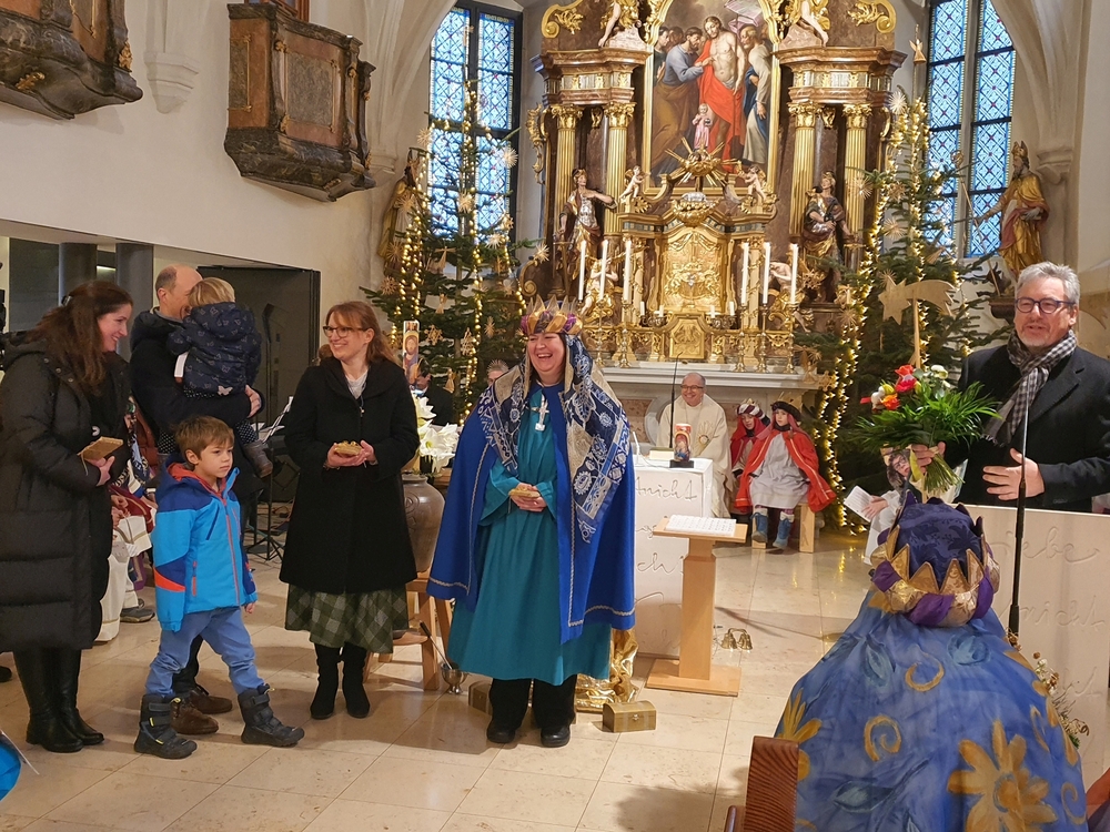 Eine Sternsingergruppe überbrachte die Botschaft, die schon Tage zuvor in den Häusern verkündet worden war: Gott braucht uns, braucht dich und mich, um der Gerechtigkeit auf Erden eine Chance zu geben. Er braucht unsere Solidarität mit den Ärmsten!
